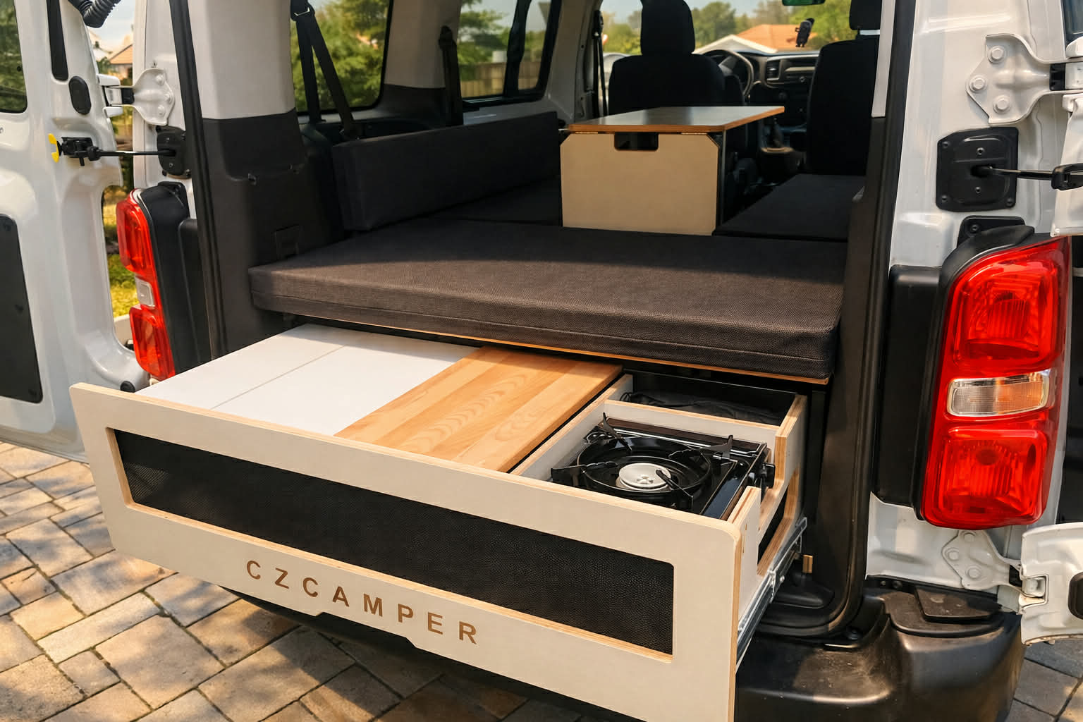 Kompletní vestavba s vybavenou kuchyňskou zásuvkou a matrací Comfort